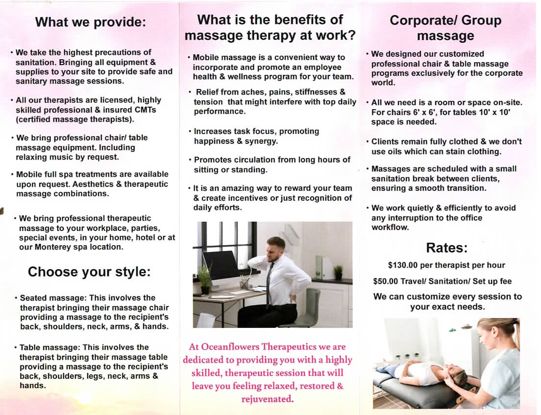 Oceanflowers Therapeutics's mission is to empower your team by promoting health and wellness within your work environment. Our team of specialized therapists conveniently brings mobile massage services to your office, hotel, special events, and celebrations. Our approach focuses on providing your employees with quality, on-site massage therapy no matter where your team is located.
