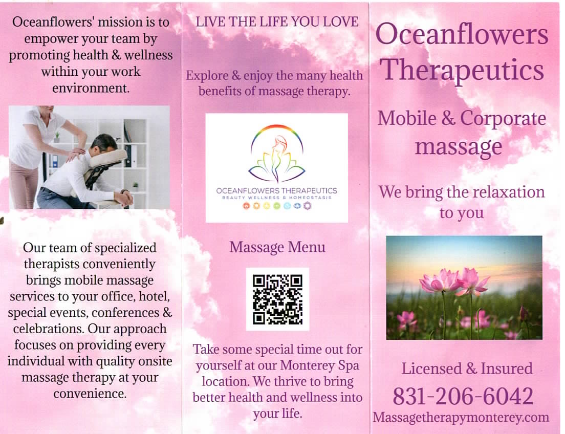 •Professional massage therapy at your workplace, parties, on-site events, in your home, or at our downtown Monterey location.